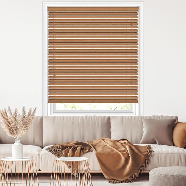 Enhance your windows with the elegance of 50mm Tuscan Oak style wooden blinds. Durable, stylish, and easy to adjust, they bring warmth, privacy, and timeless charm to any space.