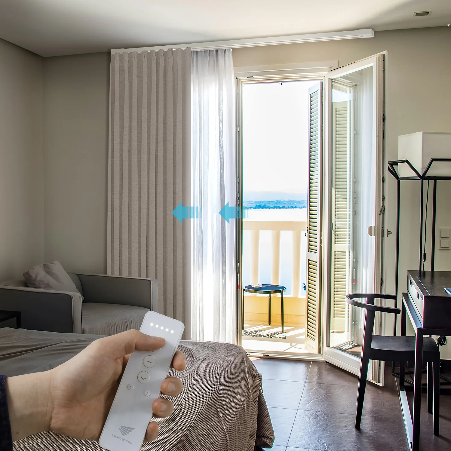 Combines sheer and blackout curtains on one motorized track for ultimate light and privacy control. -